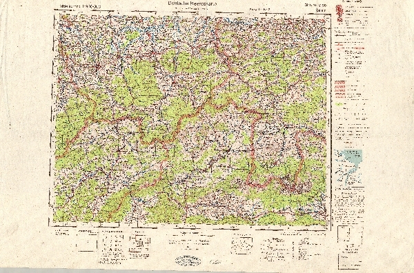 Mapa operacyjna obejmująca Cieszyn i tereny na wschód po Pieniny i Tatry. Rzeźba przedstawiona przy pomocy poziomic. W obszarze wysokogórskim rysunek skał. Zaznaczone obszary zalesione. Sieć hydrograficzna. Komunikacja - drogi i koleje. Osadnictwo. Zaznaczone granice administracyjne i polityczne. Objaśnienia w j. niem. Poza ramką objaśnienia i zestaw wykorzystanych materialów.
