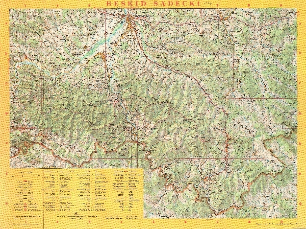 Mapa turystyczna obejmująca Beskid Sądecki po Nowy Sącz oraz Pieniny i Małe Pieniny. Rzeźba przedstawiona przy pomocy poziomic i cieniowania. Zaznaczone obszary lasów. Sieć hydrograficzna. Komunikacja - koleje i drogi. Osadnictwo. Zaznaczone szlaki turystyczne i trasy narciarskie oraz obiekty turystyczne, zabytki i infrastruktura użyteczności publicznej. Zaznaczone granice parków narodowych oraz rezerwatów przyrody.