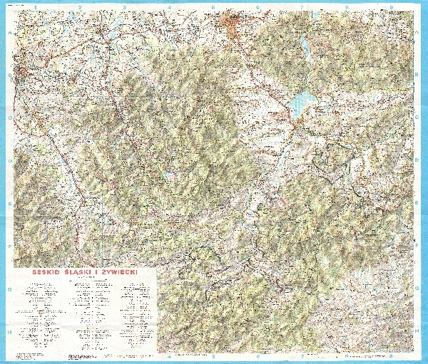 Mapa turystyczna obejmująca Beskid Śląski i Żywiecki. Rzeźba przedstawiona przy pomocy poziomic i cieniowania. Zaznaczono obszary zalesione. Sieć hydrograficzna. Komunikacja - koleje i drogi. Wyciągi narciarskie i koleje linowe. Osadnictwo. Szlaki turystyczne, narciarskie i tory saneczkowe. Zaznaczone granice parków krajobrazowych i rezerwatów przyrody.