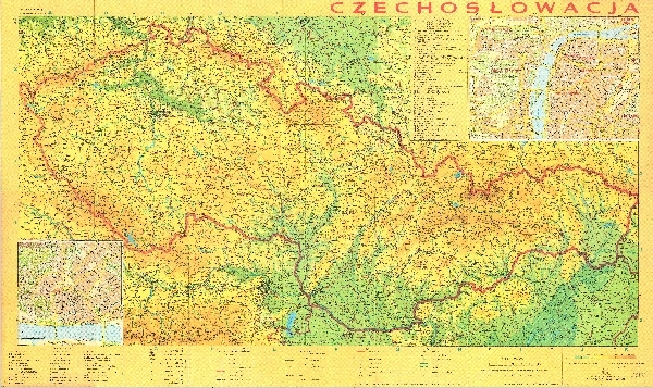 Mapa przeglądowa Czechosłowacji. Naniesiona treść fizyczna i geograficzna, góry i doliny. Sieć hydrograficzna. Rzeźba przedstawiona metodą warstwowo-barwną. Zaznaczone ważniejsze linie kolejowe i drogi. Osadnictwo. Zaznaczone granice parków narodowych. Dodatkowo plan centrum Pragi i Bratysławy. Pod mapą legenda.