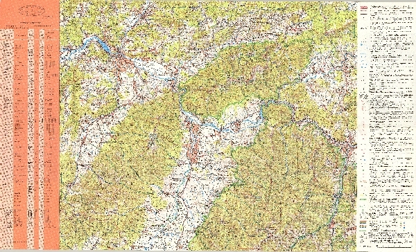 Mapa turystyczna Małej Fatry. Rzeźba przedstawiona metodą poziomic i cieniowania. Sieć hydrograficzna. Zaznaczone obszary zalesione. Komunikacja - drogi i koleje. Osadnictwo. Naniesione granice parków narodowych i obszarów chronionych. Zaznaczone szlaki turystyczne, obiekty turystyczne, zabytki oraz obiekty użyteczności publicznej. Legenda w j. słow., niem., węg., pol., ros. Adresy noclegów.