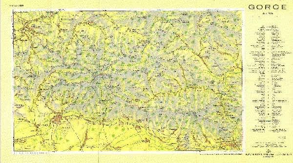 Mapa turystyczna Gorców. Rzeźba przedstawiona metodą poziomic i cieniowania. Zaznaczone obszary zalesione. Sieć komunikacyjna - koleje i drogi. Osadnictwo. Zaznaczone granice obszarów chronionych. Szlaki turystyczne, narciarskie i wyciągi narciarskie. Zaznaczone obiekty użyteczności publicznej. Z boku mapy legenda w j. pol., ang., czes. i niem.