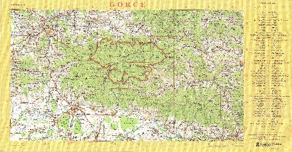 Mapa Gorców i otoczenia. Rzeźba przedstawiona przy pomocy poziomic i cieniowania. Sieć hydrograficzna. Zaznaczone obszary zalesione. Komunikacja - drogi i koleje. Osadnictwo. Wyciągi narciarskie. Zaznaczone granice parków narodowych, szlaki turystyczne, narciarskie, obiekty turystyczne i obiekty użyteczności publicznej. Legenda w j. pol., ang., cz., niem.