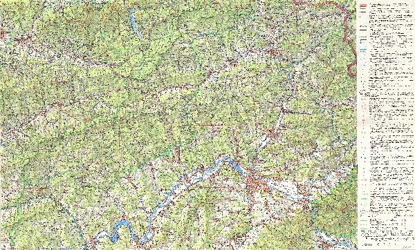 Mapa turystyczna Javornik i Kysuc. Rzeźba przedstawiona przy pomocy poziomic i cieniowania. Sieć hydrograficzna. Zaznaczone obszary zalesione. Komunikacja - drogi i koleje. Osadnictwo. Koleje linowe i wyciągi narciarskie. Naniesione granice parków narodowych i obszarów chronionych. Zaznaczone szlaki turystyczne, obiekty turystyczne, zabytki oraz obiekty użyteczności publicznej. Legenda w j. słow., niem., węg., pol., ros.