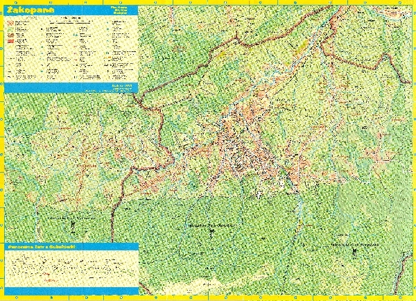 Plan miasta Zakopane, Kościelisko i Olcza. Zaznaczone poziomice. Sieć hydrograficzna, obszary zalesione, drogi, koleje linowe i wyciągi narciarskie. Zaznaczone szlaki turystyczne. Dodatkowo fragment TPN obejmujący rejon reglowej części Tatr pomiędzy Doliną Kościeliską i Doliną Olczyską. Dodatkowo panorama Tatr z Gubałówki (20x6 cm). Legenda.