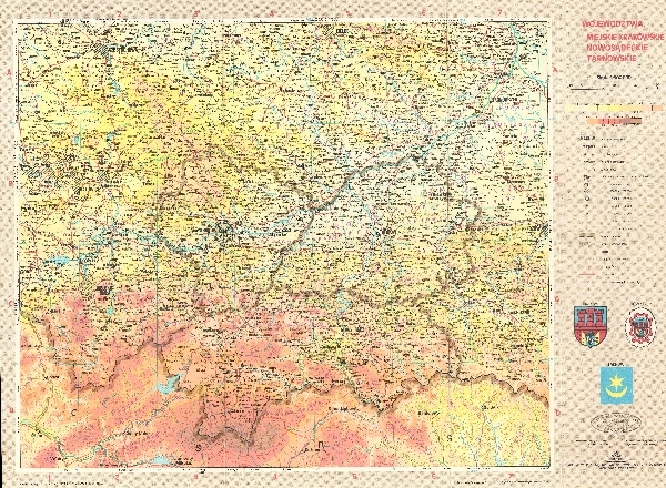 Mapa przeglądowa obecnego woj. małopolskiego. Rzeźba przedstawiona metodą warstwowo-barwną. Sieć hydrograficzna. Komunikacja - drogi i koleje. Osadnictwo. Legenda. Herby miast woj.