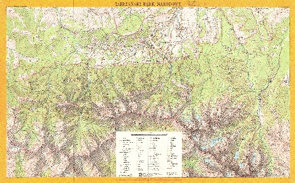 Mapa turystyczna TPN oraz Zakopanego i Pogórza Gubałowskiego. Rzeźba przedstawiona metodą poziomic i cieniowania. W obszarze wysokogórskim rysunek skał. Sieć hydrograficzna. Zaznaczone obszary zalesione. Komunikacja - koleje linowe i wyciągi narciarskie, drogi. Osadnictwo. Zaznaczone granice parku narodowego i rezerwatów. Zaznaczone szlaki turystyczne, niebezpieczeństwo lawin, nartostrady, szlaki narciarskie i tereny zjazdowe. Schroniska oraz muzea i obiekty użyteczności publicznej. Legenda.