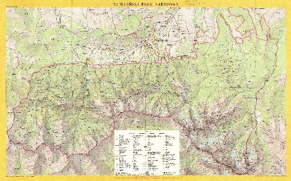 Mapa turystyczna TPN oraz Zakopanego i Pogórza Gubałowskiego. Rzeźba przedstawiona metodą poziomic i cieniowania. W obszarze wysokogórskim rysunek skał. Sieć hydrograficzna. Zaznaczone obszary zalesione. Komunikacja - koleje linowe i wyciągi narciarskie, drogi. Osadnictwo. Zaznaczone granice parku narodowego i rezerwatów. Zaznaczone szlaki turystyczne, niebezpieczeństwo lawin, nartostrady, szlaki narciarskie i tereny zjazdowe. Schroniska oraz muzea i obiekty użyteczności publicznej. Legenda.