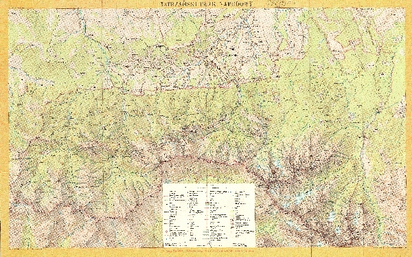 Mapa turystyczna TPN oraz Zakopanego i Pogórza Gubałowskiego. Rzeźba przedstawiona metodą poziomic i cieniowania. W obszarze wysokogórskim rysunek skał. Sieć hydrograficzna. Zaznaczone obszary zalesione. Komunikacja - koleje linowe i wyciągi narciarskie, drogi. Osadnictwo. Zaznaczone granice parku narodowego i rezerwatów. Zaznaczone szlaki turystyczne, niebezpieczeństwo lawin, nartostrady, szlaki narciarskie i tereny zjazdowe. Schroniska oraz muzea i obiekty użyteczności publicznej. Legenda.