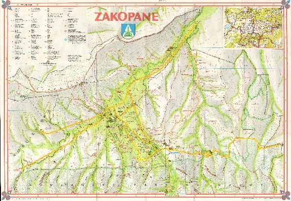 Plan Zakopanego i okolic (Gubałówka i północne obrzeża TPN). Podkład poziomicowy. Sieć hydrograficzna. Zaznaczone obszary zalesione. Komunikacja - drogi, koleje, koleje linowe i wyciągi narciarskie. Osadnictwo. Zaznaczone tylko ważniejsze obiekty zabytkowe, obiekty użyteczności publicznej i domy wczasowe. Zaznaczone szlaki turystyczne, tereny narciarskie. Legenda. Herb miasta Zakopane. Dodatkowo mapa połączeń komunikacyjnych na obszarze Podhala (15x11 cm).
