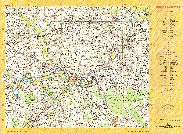 Mapa turystyczna obejmująca Łowicz i okolicę. Podkład poziomicowy i sieć hydrograficzna. Zaznaczone obszary zalesione. Komunikacja - drogi i koleje. Osadnictwo. Zaznaczone trasy turystyczne, zabytki, muzea oraz inne obiekty turystyczne. Legenda w j. pol., ang., niem., ros.