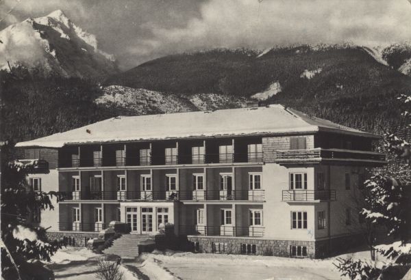 Widok na związkowy dom wypoczynkowy Wołga w Tatrzańskiej Łomnicy i jego otoczenie. W tle Sławkowski Szczyt.