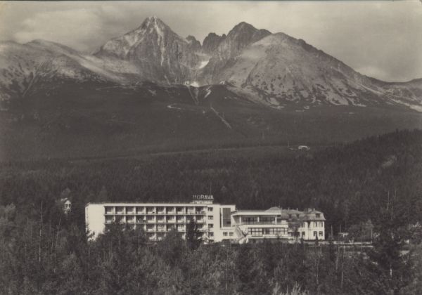 VYSOKÉ TATRY - Tatranská Lomnica Zotavovňa ROH Morava. V pozadí Lomnický štít (2632 m), Vidlové veže a Kežmarský štít (2558 m)