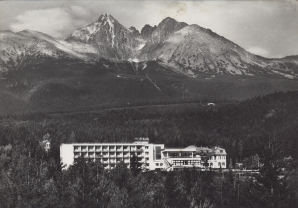 Tatry Wysokie - Tatrzańska Łomnica. Dom wypoczynkowy RZZ Morawa. W tle Łomnica, Widły i Kieżmarski Szczyt.