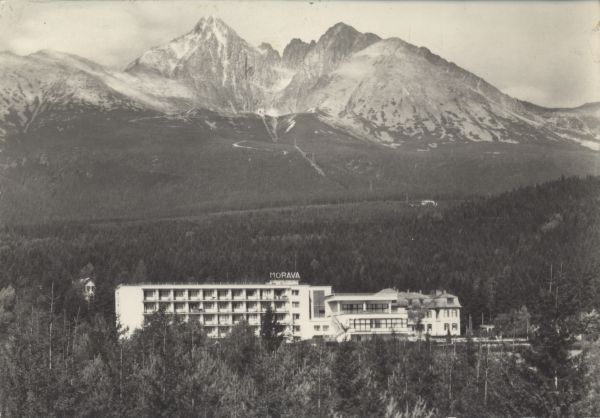 VYSOKÉ TATRY - Tatranská Lomnica Zotavovňa ROH Morava V pozadí Lomnický štít (2634 m), Vidlové veže a Kežmarský štít (2556 m).