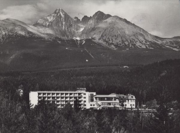 Tatry Wysokie - Tatrzańska Łomnica. Dom wypoczynkowy RZZ Morawa. W tle Łomnica, Widły i Kieżmarski Szczyt.