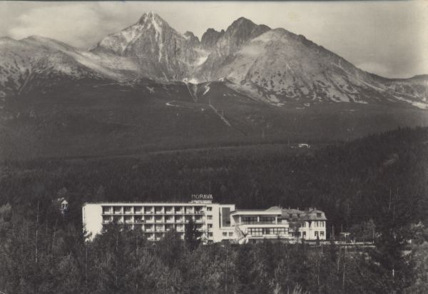 VYSOKÉ TATRY - Tatranská Lomnica Zotavovňa ROH Morava V pozadí Lomnický štít (2634 m), Vidlové veže a Kežmarský štít (2556 m).
