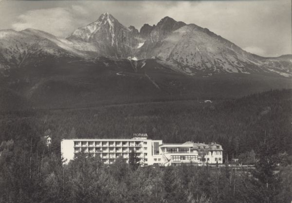 VYSOKÉ TATRY - Tatranská Lomnica (850 m) Zotavovňa ROH Morava V pozadí Lomnický štít (2632 m), Vidlové veže a Kežmarský štít (2558 m)