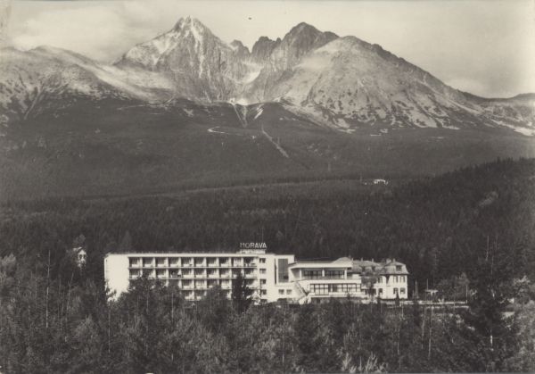 VYSOKÉ TATRY - Tatranská Lomnica Zotavovňa ROH Morava V pozadí Lomnický štít (2634 m), Vidlové veže a Kežmarský štít (2556 m)