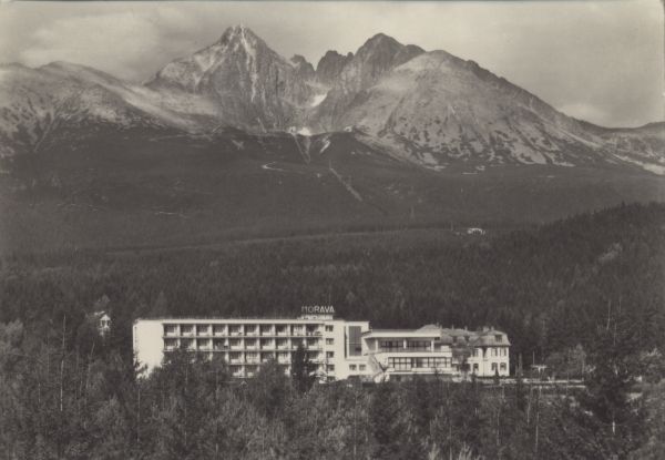 VYSOKÉ TATRY - Tatranská Lomnica Zotavovňa ROH Morava V pozadí Lomnický štít (2634 m), Vidlové veže a Kežmarský štít (2556 m)