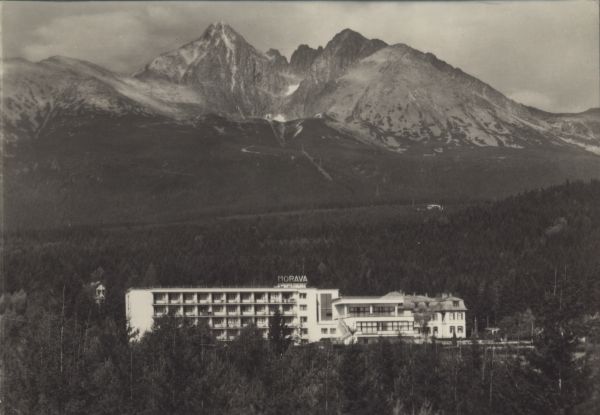 VYSOKÉ TATRY - Tatranská Lomnica Zotavovňa ROH Morava V pozadí Lomnický štít (2634 m), Vidlové veže a Kežmarský štít (2556 m)