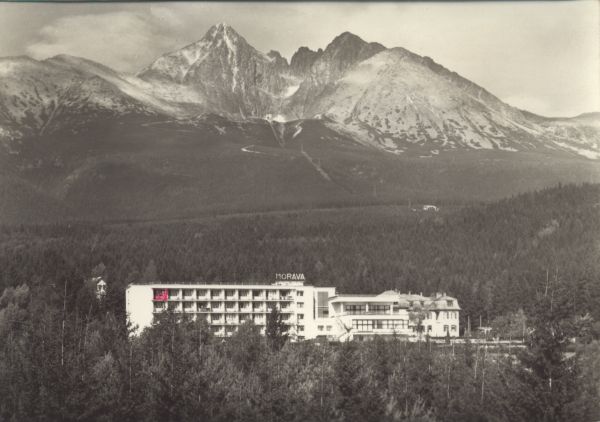 VYSOKÉ TATRY - Tatranská Lomnica (850 m) Zotavovňa ROH Morava V pozadí Lomnický štít (2634 m), Vidlové veže a Kežmarský štít (2556 m).