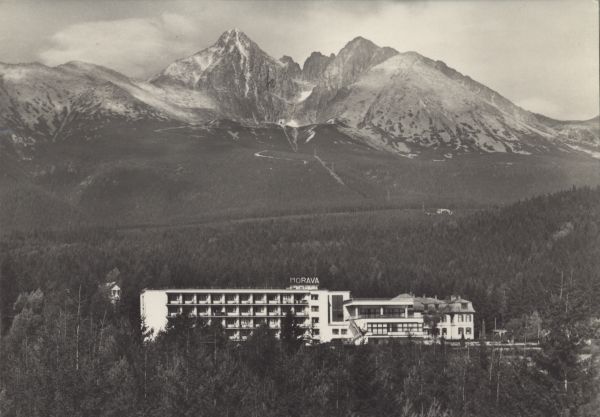 VYSOKÉ TATRY - Tatranská Lomnica Zotavovňa ROH Morava. V pozadi Lomnický ątit (2634 m), Vidly (2517 m) a Keľmarský ątit (2556 m)