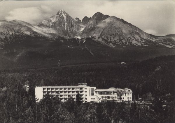 Tatry Wysokie - Tatrzańska Łomnica. Dom wypoczynkowy RZZ Morawa. W tle Łomnica, Widły i Kieżmarski Szczyt.