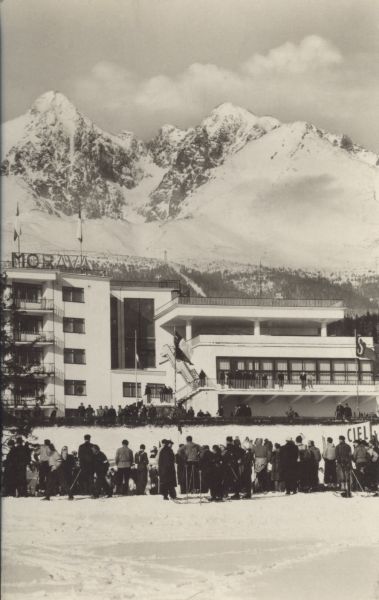 Budynek Centrali Zwi±zkowych Domów Wypoczynkowych Zdrowe Pokolenie - Morawa w Tatrzańskiej Łomnicy i jego otoczenie w scenerii zimowej. W tle Łomnica i Kieżmarski Szczyt. Przed budynkiem duża grupa narciarzy.