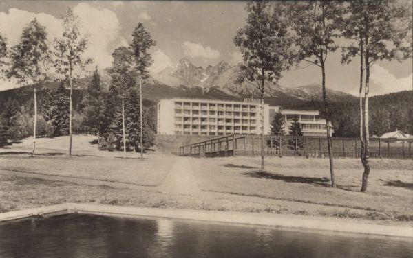 Budynek związkowego domu wypoczynkowego Morawa w Tatrzańskiej Łomnicy i jego otoczenie. Na pierwszym planie basen i park. W tle Łomnica i Kieżmarski Szczyt.