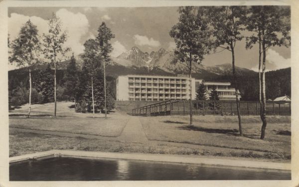 Budynek domu wypoczynkowego Morawa w Tatrzańskiej Łomnicy i jego otoczenie. Na pierwszym planie basen i park. W tle Łomnica i Kieżmarski Szczyt.
