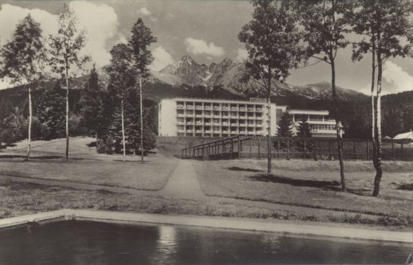 Budynek domu wypoczynkowego Morawa w Tatrzańskiej Łomnicy i jego otoczenie. Na pierwszym planie basen i park. W tle Łomnica i Kieżmarski Szczyt.