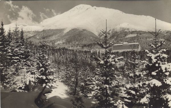Nowy Smokowiec. Widok na ośnieżony las i w oddali na budynki sanatoryjne. W tle Sławkowski Szczyt.
