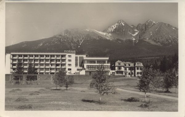 Dom wypoczynkowy Morawa w Tatrzańskiej Łomnicy i jego otoczenie. Na pierwszym planie park. W tle Łomnica, Widły i Kieżmarski Szczyt.