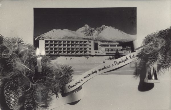 Bożonarodzeniowe i Noworoczne życzenia z Wysokich Tatr. Pocztówka okoliczno¶ciowa. Pejzaż zimowy, obiekt wypoczynkowy na tle o¶nieżonej Łomnicy i Kieżmarskiego Szczytu. Na pierwszym planie stroiki ¶wi±teczne z płon±c± ¶wiec± i dzwoneczkiem poł±czone szarf± z napisem: Vianoènę a novoroènę pozdrav z Vysokęch Tatier.