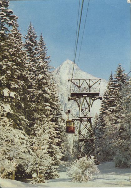 Tatry Wysokie. Kolej linowa nad Łomnicki Staw. W tle Łomnica. Tytuł również w języku: ros., niem, ang.