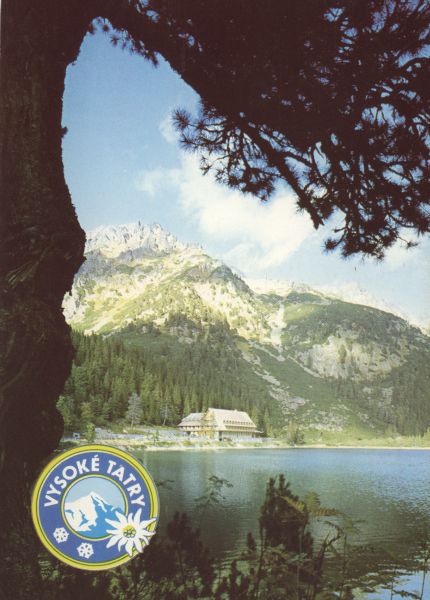 Widok na hotel górski im. kpt. Štefana Morávki przy Popradzkim Stawie, z tyłu Popradzka Grań, w prawo Złomiska Turnia. Na pierwszym planie limba (Pinus cembra L.). W lewym dolnym rogu logo miasta Vysoké Tatry.