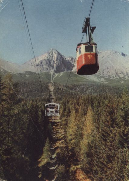 Tatrzański Park Narodowy [Słowacja]. Kolej linowa z Tatrzańskiej Łomnicy nad Łomnicki Staw. W tle Łomnica. Tytuł również w języku: ros., niem., ang.