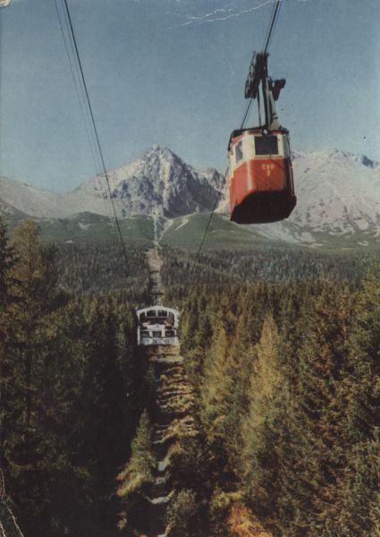 Tatrzański Park Narodowy [Słowacja]. Kolej linowa z Tatrzańskiej Łomnicy nad Łomnicki Staw. W tle Łomnica. Tytuł również w języku: ros., niem., ang.
