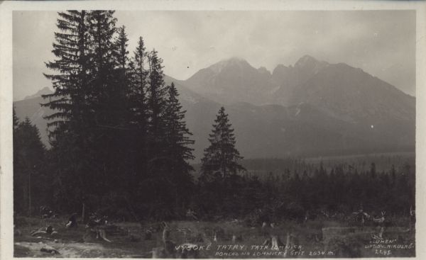 Widok na Łomnicę z Tatrzańskiej Łomnicy. Na pierwszym planie las i polana z wyciętymi drzewami. Na dole wpisany tytuł i nazwa producenta.