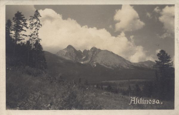 Brak tytułu. Widok na Łomnicę z Tatrzańskiej Łomnicy. Na pierwszym drzewa. W tle szczyty.