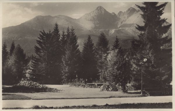 Widok na szczyty: Łomnicę (po lewej stronie) i Kieżmarski Szczyt (na prawo). Na pierwszym planie droga przez park.