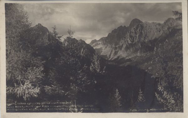 Widok z Doliny Zimnej Wody na Łomnicę. Na dole wpisany tytuł, również w języku niemieckim i węgierskim oraz nazwisko fotografa.