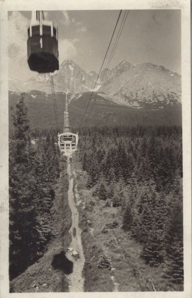 Wagon kolei linowej na trasie nad Łomnicki Staw. Na pierwszym planie drzewa i stacja pośrednia - Start. Wyżej stacja nad Łomnickim Stawem. W tle Łomnica, Widły i Kieżmarski Szczyt.