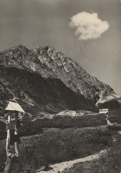 Widok z Doliny Wielickiej. Na pierwszym planie kierunkowskaz turystyczny i droga do hotelu górskiego ¦l±ski Dom. W tle ¶ciany Małego Gerlachu w masywie Gerlachu.