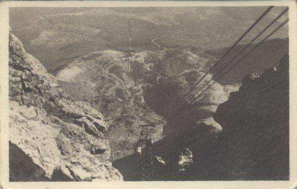 Widok z Łomnicy na Dolinę Łomnicką oraz trasę kolei linowej i stację pośrednią nad Łomnickim Stawem.