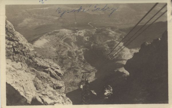 Widok z Łomnicy na Dolinę Łomnicką oraz trasę kolei linowej i stację pośrednią nad Łomnickim Stawem.