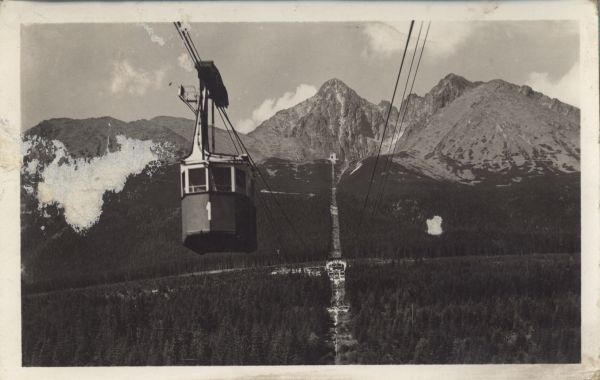 Wagonik kolei linowej na Łomnicę na trasie do Łomnickiego Stawu nad Wielkim Lasem. Widoczna stacja po¶rednia - Start. W tle Łomnica i Kieżmarski Szczyt.