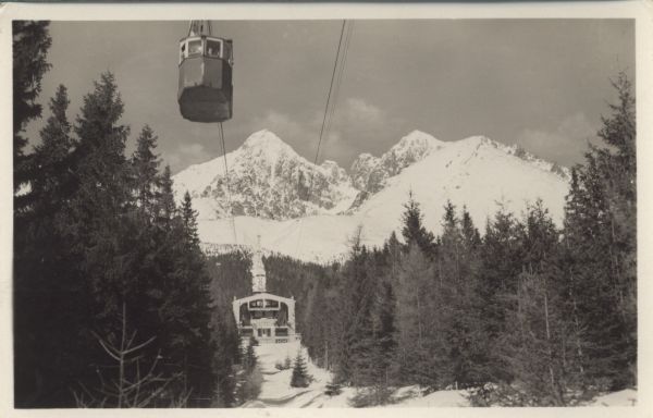 Vysoké Tatry - Tatranská Lomnica 900 m n. m. Lanovka na Lomnický ątít 2634 m. v pozadí Keľmarský ątít 2556 m.