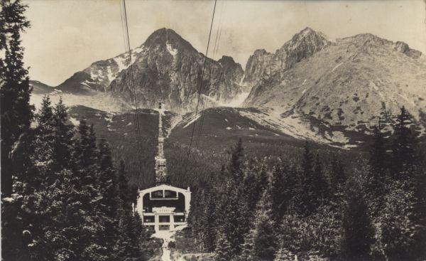 Kolej linowa na Łomnicę. Widoczna stacja pośrednia - Start. W tle Łomnica i Kieżmarski Szczyt.